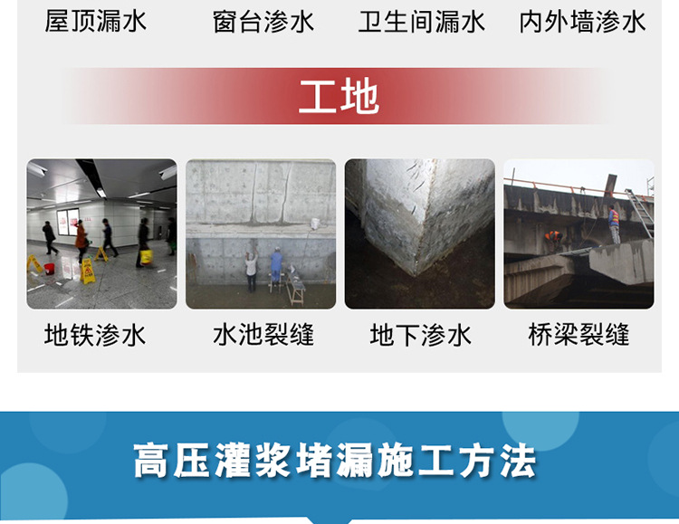 高压注浆堵漏是通过专用设备将聚氨酯、环氧树脂等防水材料以高压(通常300-500kg/cm²)注入混凝土裂缝或孔隙中。材料遇水后发生交联反应,膨胀形成弹性体,填充所有缝隙并固化,达到止水目的